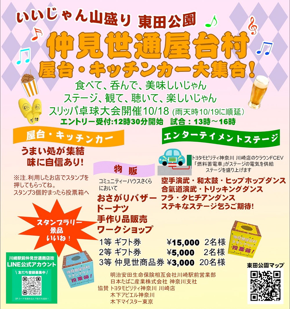 2025年10月18日(土)、19日(日)の2日間、東田公園にて、様々な屋台やキッチンカーが大集合する「仲見世通屋台村」やステージイベントを開催いたします。